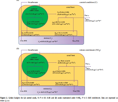 珊瑚在寡營養條件下采用保守策略(低碳損失),而富營養化可能加劇碳浪費(如呼吸和黏液分泌增加)。