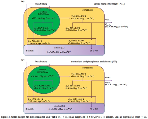 N:P比率調節營養分配:在平衡N:P下(如NH4+與磷聯合),碳向共生藻傾斜,減少宿主獲益,可能導致共生失衡。