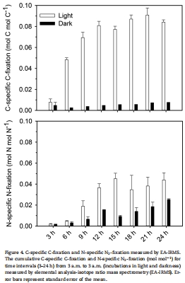 數據內容:EA-IRMS測量顯示,碳特異性碳同化率在早晨至中午增加近10倍,之后保持穩定;氮特異性固氮率在光下和暗下均隨時間增加。
