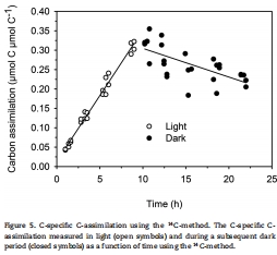 數據內容:在恒定光強下,碳同化率隨培養時間線性增加(P = 0.034 × t + 0.014 μmol C μmol C?1 h?1);轉入黑暗后立即下降,平均呼吸速率R = 0.0074 μmol C μmol C?1 h?1。