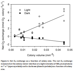 數據內容:通過測量群體-水界面的穩態氧梯度,計算出光合作用(P)和呼吸作用(R)均為群體體積的線性函數(例如,P = 126 × V_colony - 0.34 nmol O? h?1)。暗呼吸與總光合作用的比值為0.23 ± 0.09。
