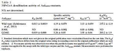 數據內容:野生型AcdDPN7的Km為0.013 mM,kcat為3.13 s?1;R84K突變體無活性;Q246E突變體Km升至0.019 mM,kcat略增至3.93 s?1。
