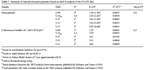 研究意義:直接證實生物膜內形成了晶質鈾酰磷酸鹽礦物(類似meta-autunite),為“生物礦化”提供分子水平證據。數據來自圖1(EXAFS光譜和傅里葉變換)和表2(擬合參數)。