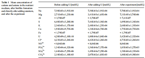 研究意義:量化鈾固定效率,并提示磷酸鹽釋放(來自細胞多磷酸鹽)是礦化的驅動因素。數據來自表1(離子濃度時序變化)。