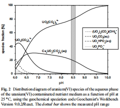 數據內容:優勢場圖顯示在pH 8.5附近,UO?(CO?)???和Ca?UO?(CO?)?為優勢物種。