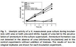數據內容:N. moscoviensis 在含尿素培養基中培養后,培養上清液中銨濃度顯著上升(從0升至約0.8 mM),而對照組無變化;添加亞硝酸鹽不影響銨產生。
