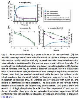 數據內容:在厭氧條件下,添加甲酸后,N. moscoviensis 將硝酸鹽幾乎化學計量地還原為亞硝酸鹽(硝酸鹽減少約1.2 mM,亞硝酸鹽增加約1.0 mM),甲酸被完全消耗;好氧條件下,甲酸也可被氧化,伴氧氣消耗。