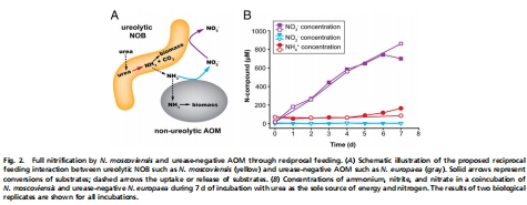 研究意義:驗證了“互惠喂養”模型:N. moscoviensis 水解尿素供氨給AOM,AOM氧化氨產生亞硝酸鹽供NOB使用,實現全硝化。數據來自圖2B(硝酸鹽積累曲線)。