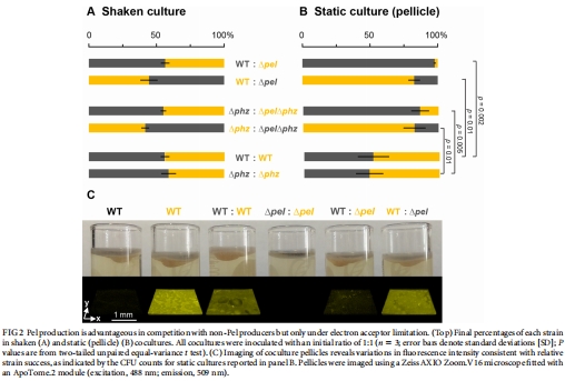 研究意義:表明 Pel 生產的適應性優勢高度依賴環境:在氧氣受限的 pellicle 中至關重要,但在菌落中作用復雜,可能受微環境影響。