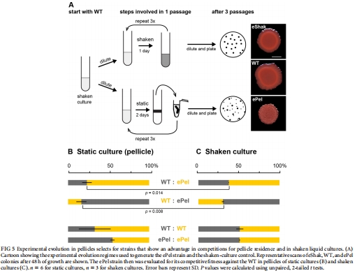 進化實驗顯示,環境能快速選擇 Pel 生產表型:pellicle 選擇過生產,菌落邊緣選擇減少生產,表明兼性控制允許種群在變化環境中優化適應性。