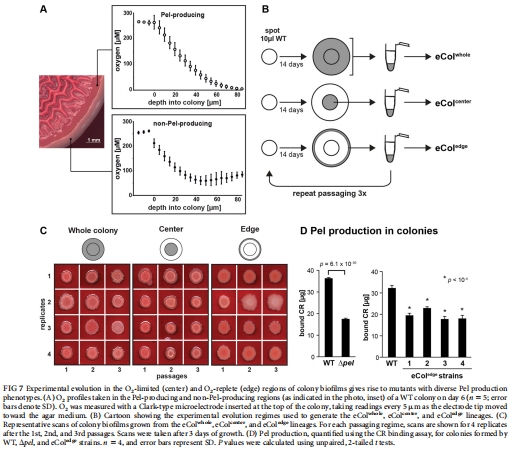 通過進化實驗,揭示不同環境(如 pellicle 和菌落邊緣 vs. 中心)如何選擇 Pel 生產表型。