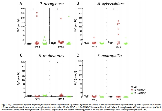 高病原性CF菌株(P. aeruginosa、A. xylosoxidans、B. multivorans)能通過反硝化(產生N?O)在厭氧環境中生長,這可能增強其在CF痰液缺氧條件下的存活和致病性。