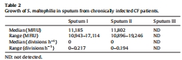 研究意義:結合厭氧實驗,說明S. maltophilia在CF缺氧環境中代謝不活躍,解釋其低病原性。數據來自文本中“Growth of isolates”部分和Table 2(生長率統計)。