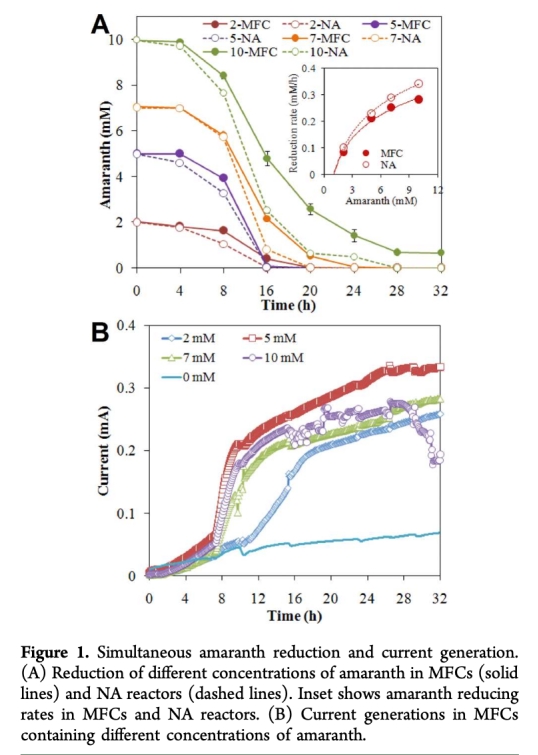 1 測量了azo染料還原率和電流生成,數據來自圖1。研究意義在于顯示azo還原與電流生成同時發生,但存在競爭;azo還原率隨濃度增加,而電流在含azo的MFCs中增強,表明電子轉移網絡復雜,為優化BES性能提供依據。