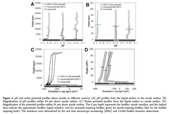 3 測量了生物膜內的pH和氧化還原電位剖面,使用丹麥Unisense微電極,數據來自圖3。研究意義在于揭示質子積累在僅陽極呼吸生物膜中存在,而azo呼吸耗散該積累;氧化還原電位剖面顯示生物膜與陽極表面的電位差,支持電子跳躍機制,為電子轉移模型提供實驗證據。
