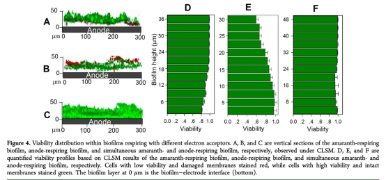4 測量了生物膜活性分布(viability),數據來自圖4。研究意義在于顯示生物膜活性在僅使用陽極或azo時呈分層分布(反向模式),而同時使用兩者時活性更高且均勻,表明雙向電子轉移補償了局限性,為多電子受體環境下的微生物適應性提供見解。