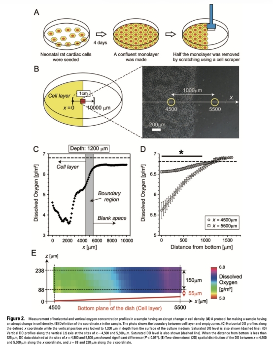 2 測量了垂直氧濃度剖面在特定位點(x=4500μm和5500μm),數據來自圖2D。研究意義在于顯示即使位點間距離僅1毫米,氧剖面也顯著不同,驗證系統能檢測局部細胞密度變化,精度在垂直方向達40-50微米。