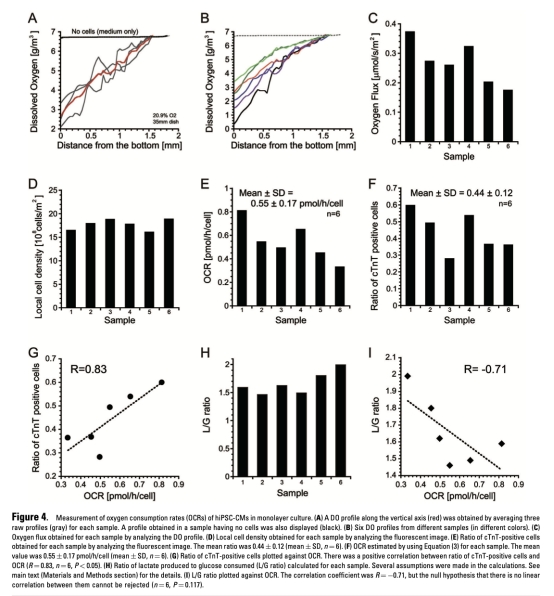 4 測量了hiPSC衍生心肌細胞的垂直氧剖面,通過平均三次測量獲得線性剖面,數據來自圖4A和4B。研究意義在于基于氧通量和細胞密度估計氧消耗率,提供hiPSC-CMs的代謝數據,平均OCR為0.55±0.17 pmol/h/細胞,顯示與心肌細胞比例正相關,有助于理解細胞成熟度和代謝異質性。