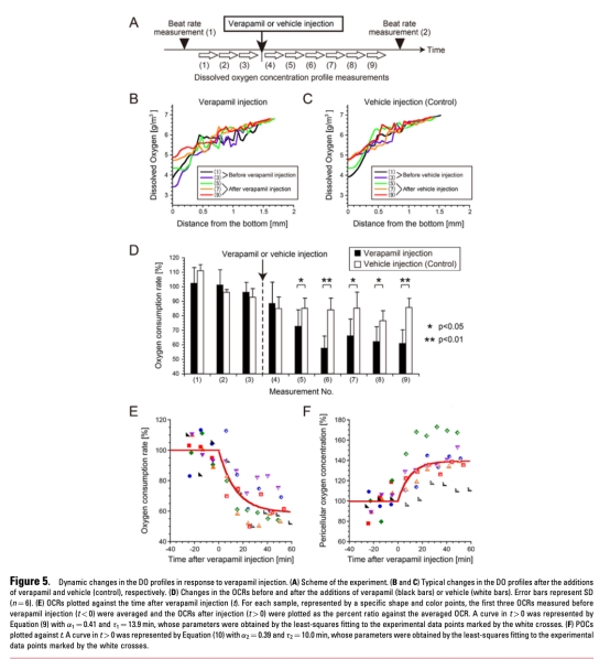 5 測量了維拉帕米注射后的氧濃度和OCR時間變化,數據來自圖5B、5C、5D、5E和5F。研究意義在于證明系統能檢測OCR的瞬時變化(OCR在13.9分鐘內下降至59%),但響應時間受氧擴散限制(理論時間常數約8分鐘),實際測量與理論一致,顯示系統在監測局部代謝變化方面的潛力和局限性。