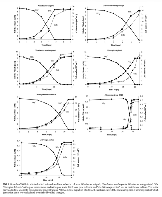 1 測量了NOB在亞硝酸鹽限制培養基中的生長曲線,包括亞硝酸鹽消耗和細胞增長,數據來自圖1和表1。研究意義在于確定了不同NOB的生長速率和產率,顯示Nitrospira和Nitrotoga在低底物下更持久,而Nitrobacter生長更快,為理解其生態策略(r/K選擇)提供基礎。