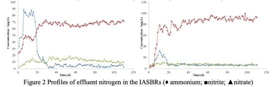1 測量了反應(yīng)器出水中的銨、亞硝酸鹽和硝酸鹽濃度隨時間的變化,該數(shù)據(jù)來自圖2。研究意義在于驗證間歇曝氣策略能否成功實現(xiàn)部分硝化,并確定反應(yīng)器達(dá)到穩(wěn)定狀態(tài)的時間。數(shù)據(jù)顯示兩個反應(yīng)器均實現(xiàn)了高效的部分硝化(亞硝酸鹽積累效率分別為87%和93%)。