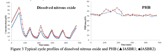 5 測量了IASBR2中好氧顆粒污泥的PHB含量在典型周期內(nèi)的變化,該數(shù)據(jù)來自圖3。研究意義在于將PHB的消耗(作為內(nèi)碳源用于反硝化)與氧化亞氮的持續(xù)生成聯(lián)系起來,解釋了IASBR2排放量更高的原因,即碳源不足導(dǎo)致反硝化不完全,產(chǎn)生更多氧化亞氮。
