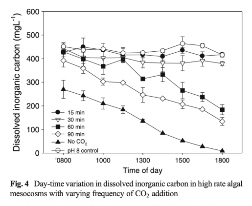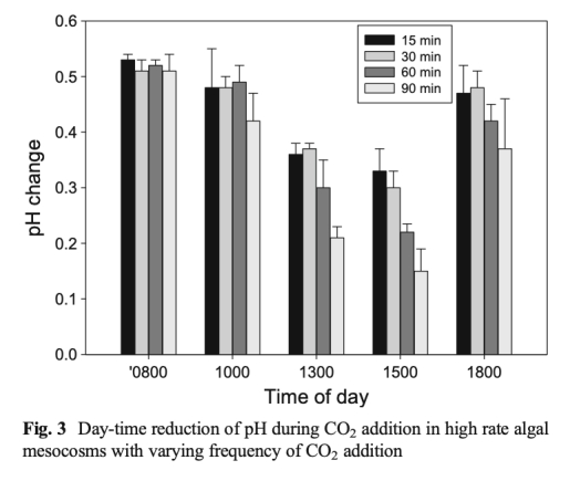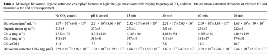1 測量了白天不同時間點各處理組的pH變化,該數據來自圖2。研究意義在于直接反映CO2添加頻率對培養系統碳供應和pH控制效果的影響,顯示高頻率添加(15分鐘和30分鐘)能更好地將pH維持在目標值(~8)附近,而低頻率添加(60分鐘和90分鐘)則導致下午pH顯著升高。