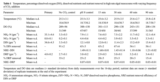 4 測量了出水中的銨氮、硝氮、溶解無機氮和溶解活性磷濃度,并計算了去除率和單位生物量的營養鹽去除效率,該數據來自表1。研究意義在于評估CO2添加頻率對營養鹽去除效果的影響,發現高頻率添加能維持較高的DIN去除效率,而低頻率添加則效率降低,同時區分了微藻吸收和物理化學過程(如氨揮發)對脫氮的貢獻。