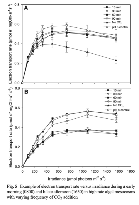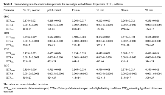 6 通過脈沖振幅調制熒光測量技術測定了不同時間點的快速光曲線,推導出最大電子傳遞速率、光利用效率和光飽和點,該數據來自表3和圖5。研究意義在于評估微藻的光合潛力,表明高頻率CO2添加能維持較高的ETRmax和ETRek,尤其在下午,而低頻率添加則導致光合潛力下降,接近不添加CO2的控制組。