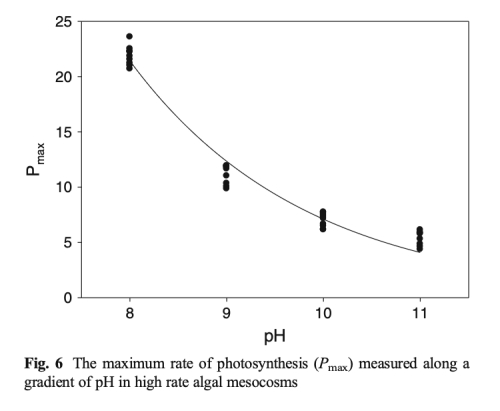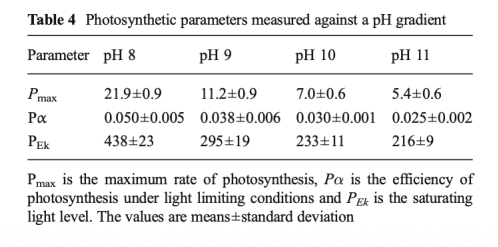 7 使用丹麥Unisense的Clark型快速響應微傳感器測量了沿pH梯度變化的光合作用產氧量,推導出最大光合速率、光利用效率和光飽和點,該數據來自表4和圖6。研究意義在于直接驗證pH升高(DIC減少)對微藻光合速率的抑制作用,顯示Pmax在pH 8至9之間減半,為觀測到的性能差異提供了生理機制解釋。