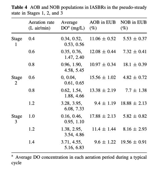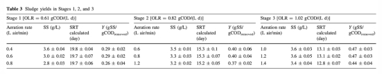 3 數據來自表3和表4:測量了污泥產率(Y)和AOB/NOB種群比例。例如,在OLR增加時,污泥產率從0.26增加到0.47 gSS/gCOD去除,AOB/NOB比率隨DO濃度變化。研究意義是揭示加載速率和曝氣對微生物群落和污泥產量的影響,為工藝控制提供微生物學基礎。
