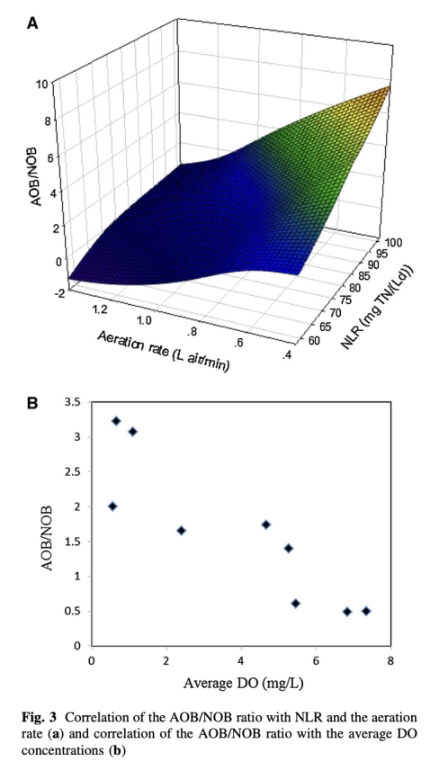 4 數據來自圖3:顯示了AOB/NOB比率與氮加載速率(NLR)和曝氣速率的相關性(R_AOB/NOB = 0.07 NLR - 4.65 A + 0.27)。研究意義是證實低DO條件有利于AOB優勢,促進PND過程,提高氮去除效率。