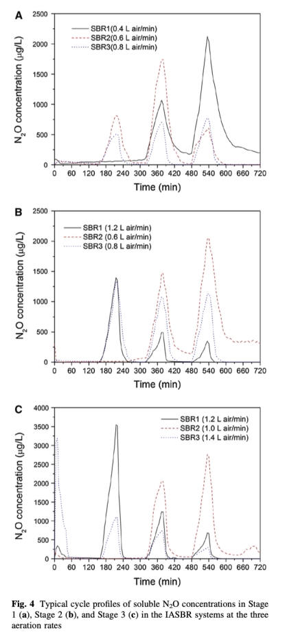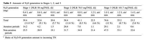 5 數據來自圖4和表5:測量了典型周期中溶解N2O濃度和N2O生成量。例如,在最佳曝氣速率下,非曝氣期N2O生成量最高。研究意義是量化N2O排放規律,幫助評估溫室氣體產生機制和減排策略。