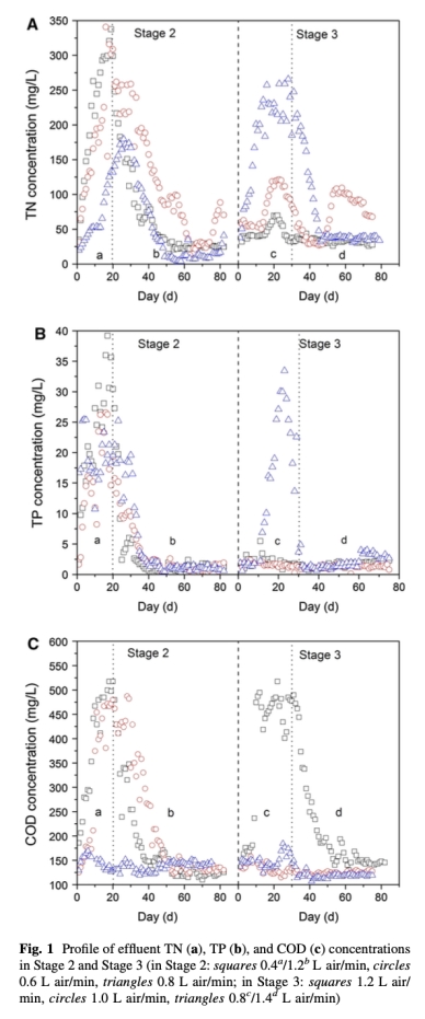 1 數據來自圖1:測量了不同曝氣速率下 effluent TN、TP和COD濃度。例如,在OLR為0.82 gCOD/(L·d)時,曝氣速率從0.4增加到1.2 L空氣/分鐘,TN去除效率提高。研究意義是驗證曝氣速率對氮和磷去除的關鍵影響,幫助確定最佳曝氣條件以實現穩定處理。