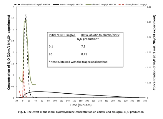 3. 羥基胺濃度影響數據:來自圖3。顯示不同初始羥基胺濃度對N2O生產的影響,研究意義是確定非生物反應在低羥基胺條件下的主導性,并揭示反應機制對操作條件的敏感性。
