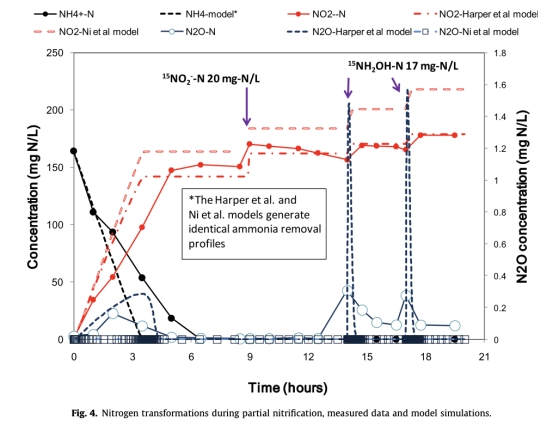 2. 氮轉化數據:包括氨氮去除和亞硝酸鹽生產,來自圖4。這些數據記錄了部分硝化過程中的氮物種變化,研究意義是評估模型對氮去除速率的準確性,并識別非生物反應對整體氮平衡的影響。
