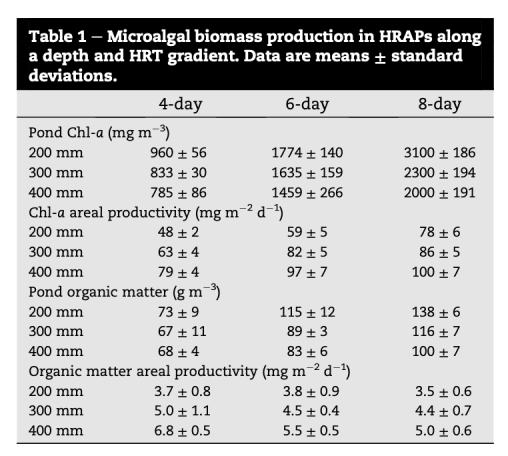 1. 數(shù)據(jù)來(lái)自表1:測(cè)量了葉綠素a(Chl-a)生物量和有機(jī)物質(zhì)生產(chǎn)隨塘深和HRT的變化。例如,在200mm塘深、8天HRT時(shí),Chl-a為3100±186 mg m?3。研究意義是量化生物量積累,顯示HRT對(duì)生物量有正向影響,為優(yōu)化HRAP操作提供依據(jù)。