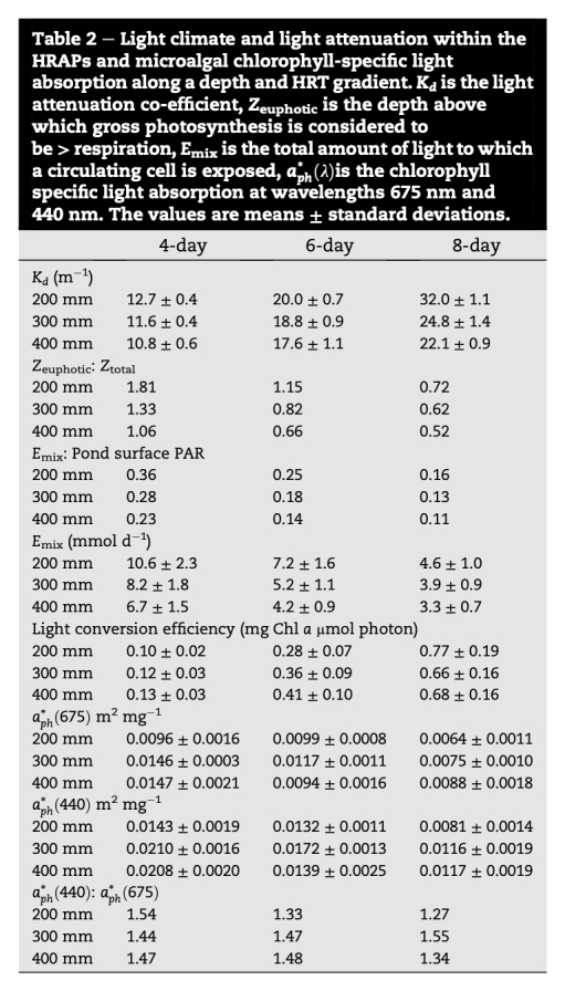 2. 數(shù)據(jù)來(lái)自表2:測(cè)量了光衰減系數(shù)(Kd)、 euphotic區(qū)深度比例和混合光 exposure(Emix)。例如,Kd隨HRT增加而增加,在200mm塘深、8天HRT時(shí)Kd為32.0±1.1 m?1。研究意義是揭示光衰減與生物量關(guān)系,幫助理解光限制機(jī)制。