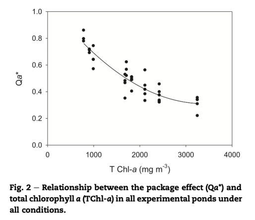 3. 數(shù)據(jù)來(lái)自圖2:測(cè)量了包效應(yīng)(Qa)與總?cè)~綠素a的關(guān)系,顯示Qa隨生物量增加而減少。研究意義是表明內(nèi)部自遮蔭效應(yīng)如何降低光吸收效率,指導(dǎo)改善光利用。