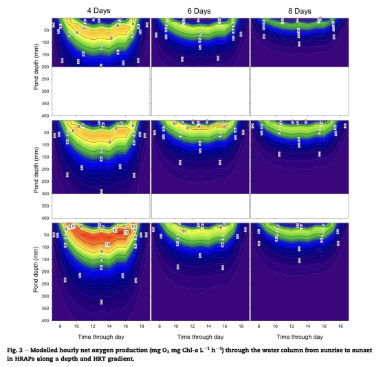 5. 數(shù)據(jù)來(lái)自圖3、4、5:通過(guò)模型和實(shí)驗(yàn)測(cè)量?jī)粞鯕馍a(chǎn)隨深度、HRT和轉(zhuǎn)換率的變化。例如,在陰天條件下,增加轉(zhuǎn)換率能提高氧氣生產(chǎn)。研究意義是驗(yàn)證光暗循環(huán)對(duì)光合作用的補(bǔ)償作用,為HRAP設(shè)計(jì)提供優(yōu)化策略。