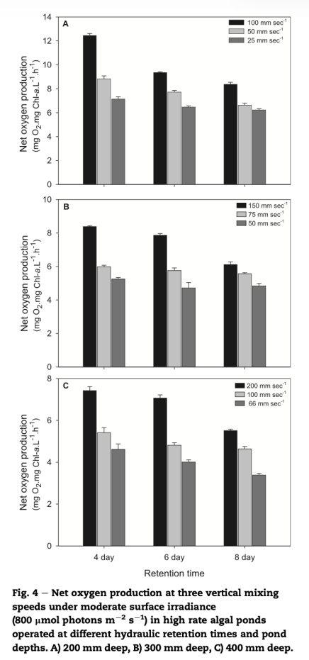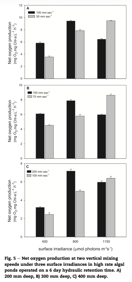 4. 數(shù)據(jù)來(lái)自表3:測(cè)量了光合作用參數(shù)(Pmax、α、Ek)在不同輻照度下的變化。例如,Pmax在400mm塘深、4天HRT、1100μmol photons m?2 s?1時(shí)為13.5±0.3 mg O? mg Chl-a?1 h?1。研究意義是評(píng)估光合效率,顯示深層塘和短HRT能增強(qiáng)光合作用。