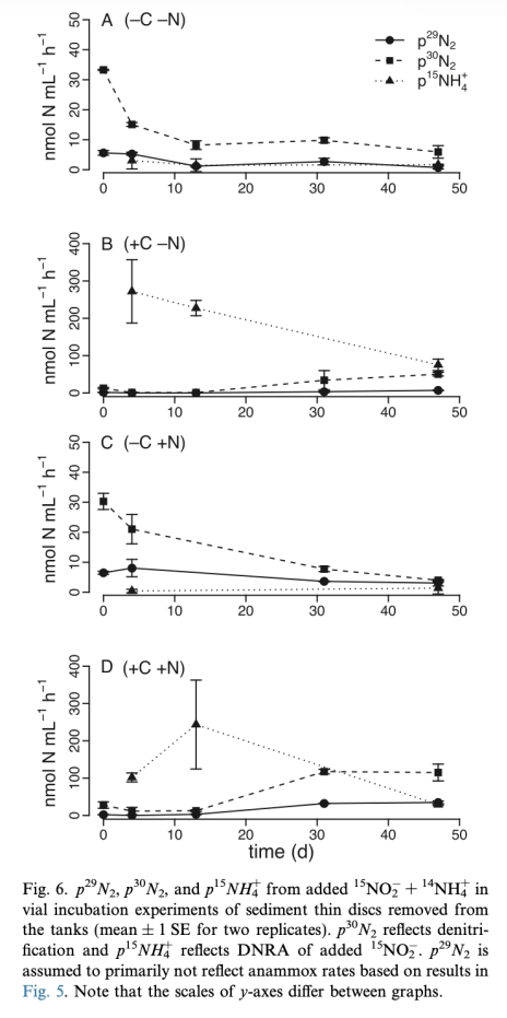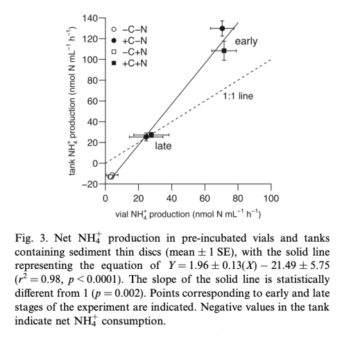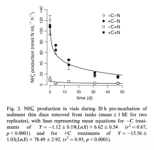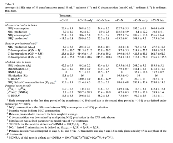2 預(yù)培養(yǎng)小瓶中NH4生產(chǎn)速率數(shù)據(jù),來(lái)自圖2和圖3。研究意義是評(píng)估有機(jī)碳分解速率,作為電子供體供應(yīng)的代理,鏈接到DNRA和N2生產(chǎn)的分配。