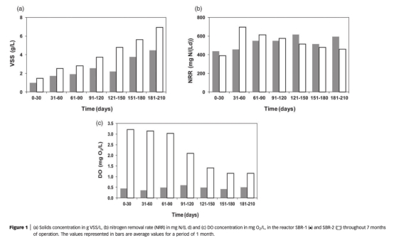 1 數(shù)據(jù)來自圖1:測量了生物量濃度(VSS)、氮去除率(NRR)和DO濃度隨時間變化。例如,SBR-1生物量從1.0 g VSS/L增至4.5 g VSS/L,SBR-2從0.7 g VSS/L增至7.0 g VSS/L,NRR均達(dá)0.6 g N/(L·d)。研究意義是顯示不同DO下生物量積累和氮去除效率相似,但生物量形態(tài)差異顯著,表明DO影響顆粒化而非基本去除能力。