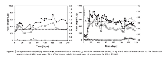 這篇論文摘要指出,研究比較了在兩個不同溶解氧(DO)濃度下啟動的ELAN®工藝(一種anammox基自養(yǎng)脫氮工藝)的表現(xiàn)。SBR-1在DO為0.4 mg O2/L下啟動,SBR-2在DO為3.0 mg O2/L下啟動。盡管兩個反應(yīng)器都達(dá)到了約0.6 g N/(L·d)的氮去除率,但生物量形態(tài)差異顯著:SBR-1中顆粒生物量較少,顆粒直徑僅1.1 mm;SBR-2中生物量主要以顆粒形式存在,平均直徑達(dá)3.2 mm。氧微剖面分析顯示,SBR-2的顆粒需要更高DO(8 mg O2/L)才能完全氧滲透,而SBR-1的顆粒在1 mg O2/L下即被氧滲透。這表明高DO促進(jìn)厚層氨氧化細(xì)菌(AOB)生長,保護(hù)anammox細(xì)菌免受不利條件影響。
