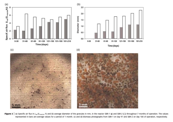 3 數(shù)據(jù)來自圖3:測量了比空氣通量和顆粒平均直徑。SBR-2顆粒直徑達(dá)2.3 mm,而SBR-1為1.1 mm。研究意義是表明高DO促進(jìn)大顆粒形成,增強(qiáng)沉降性,提高系統(tǒng)穩(wěn)定性。