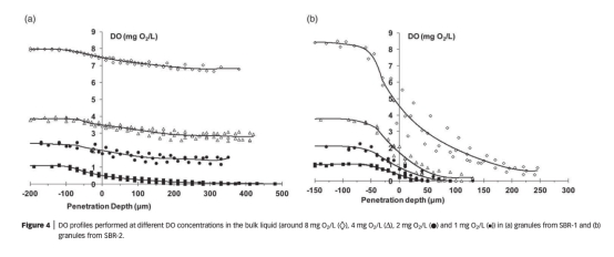 4 數(shù)據(jù)來自圖4:通過氧微剖面測量顆粒內(nèi)部氧滲透深度。SBR-1顆粒在低DO(1 mg O2/L)下氧滲透150μm,SBR-2顆粒需高DO(8 mg O2/L)才完全滲透。研究意義是揭示DO控制顆粒內(nèi)部好氧/缺氧區(qū)分布,影響AOB和anammox空間定位,從而決定工藝魯棒性。