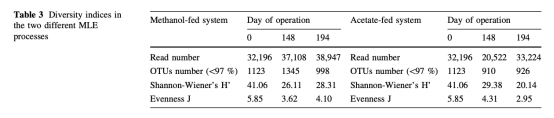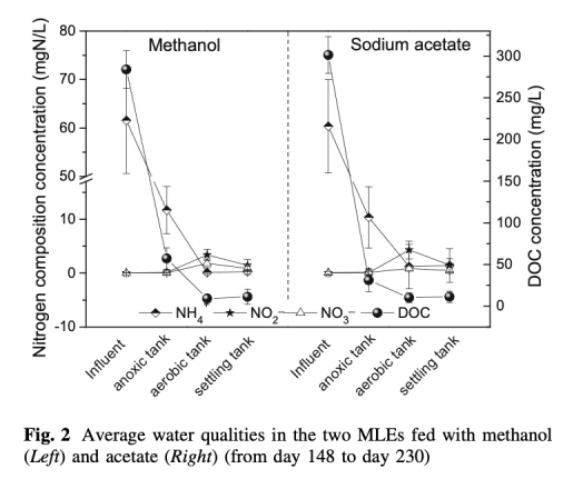 1. 水質參數:測量了溶解有機碳(DOC)、銨離子(NH4+)、亞硝酸鹽(NO2-)和硝酸鹽(NO3-)濃度,數據來自圖2。研究意義是評估碳源對氮去除效率的影響,顯示兩種系統去除效率相似,但乙酸鈉系統有輕微更高的亞硝酸鹽積累,這可能與硝化性能差異相關。