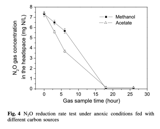 3. N2O還原率:通過批次實驗測量了生物質在缺氧條件下的N2O還原速率,數據來自圖4。研究意義是揭示碳源如何影響反硝化活性,乙酸鈉系統更高的還原率解釋了其低排放原因,關聯到微生物功能。