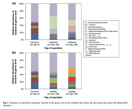5. 微生物群落結構:通過16S rRNA基因測序分析了屬水平群落,數據來自圖6和表3。研究意義是揭示碳源如何塑造群落,乙酸鈉系統富集了N2O還原菌(如Dechloromonas和Rubrivivax),而甲醇系統以無法還原N2O的菌屬為主,這直接關聯到N2O排放差異。