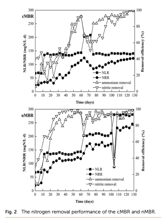 1. nMBR比cMBR能更快啟動(dòng)anammox過程(44天 vs 56天),并獲得更高氮去除率(245.4 mg N/L/d vs 122.6 mg N/L/d),顯示無紡布膜在增強(qiáng)性能方面的顯著優(yōu)勢(shì)。